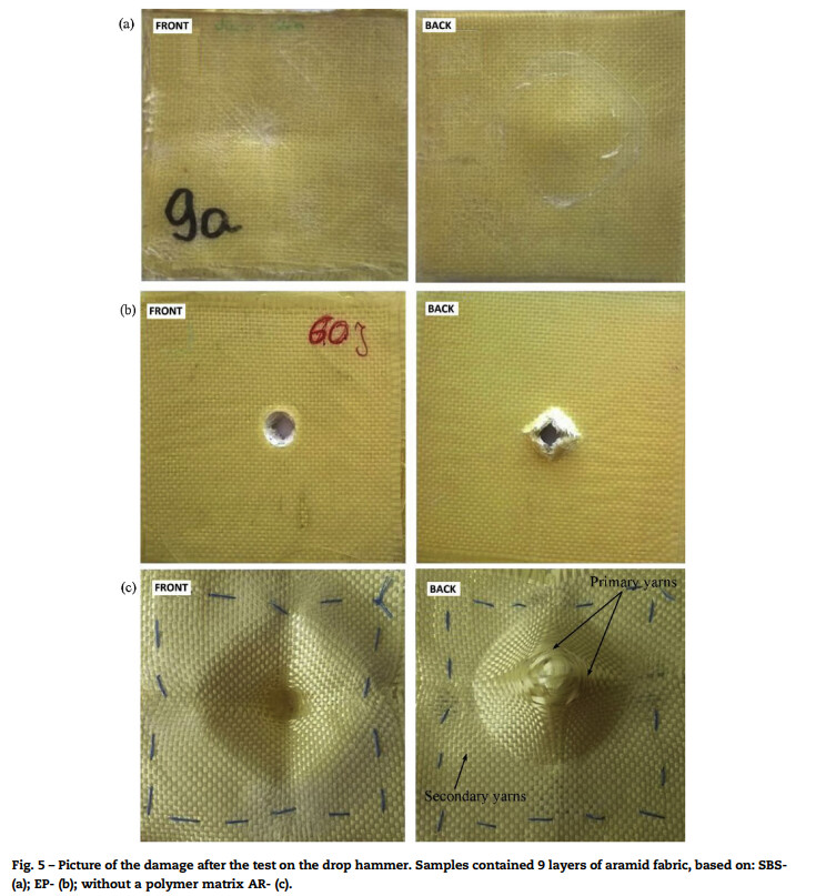 In “experimental analysis of puncture resistance of aramid laminates on styrene-butadiene-styrene and epoxy resin matrix for ballistic applications” Pach et al. examined the ballistic resistance of raw woven kevlar laminate, a SBS resin-infused laminate composite, and an epoxy-infused laminate composite. Layer count was kept constant. The raw kevlar laminate performed best by a wide margin – being both the lightest, without resin weight, and the most resistant to perforation. The SBS composite, more flexible than the epoxy composite, also performed reasonably well, with the epoxy composite falling quite far behind them both.