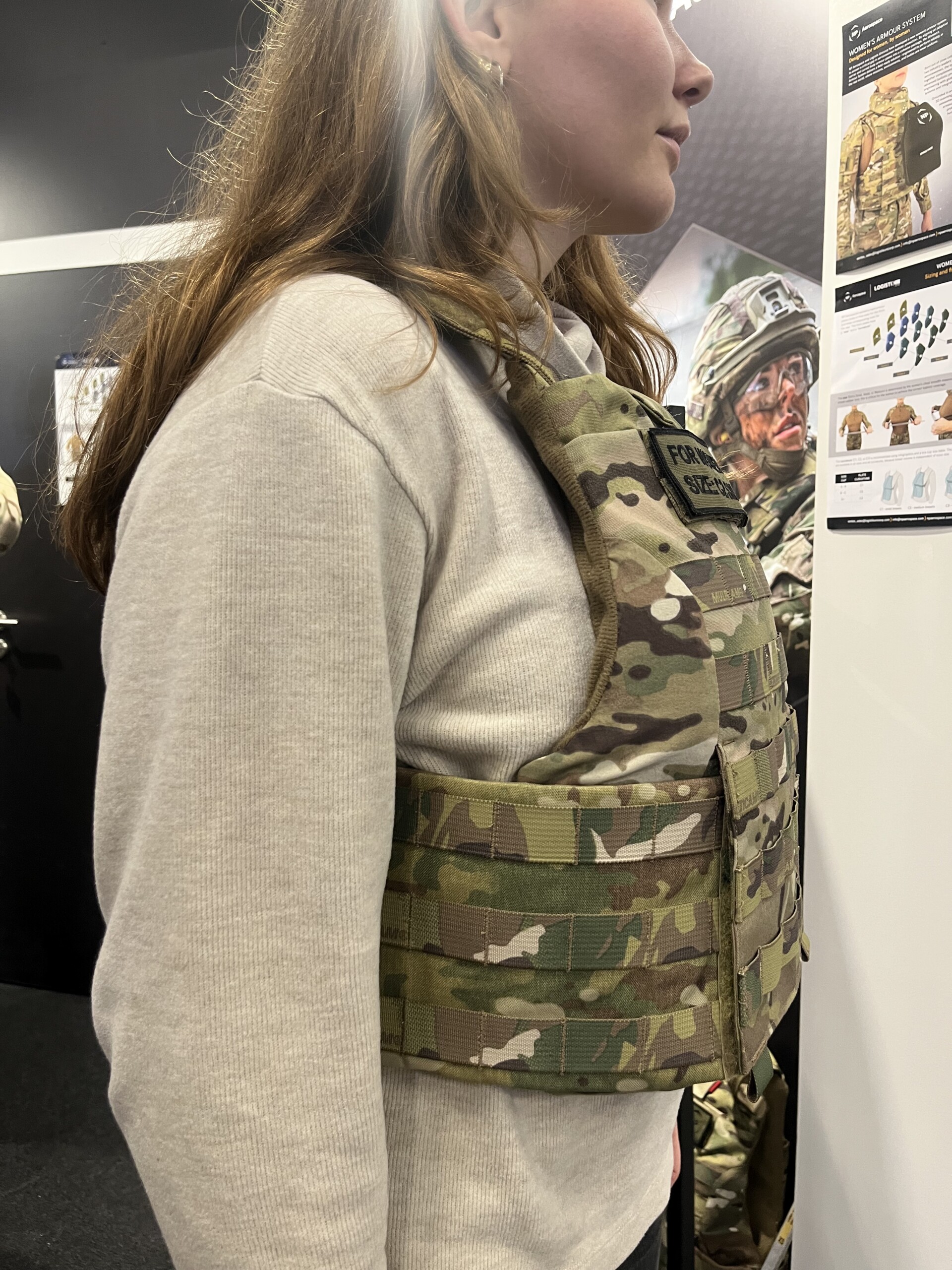 I had the privilege of fitting the plates myself at this show. I was taken through the sizing process, using a tool explained by White to be easy enough that women in conflict zones can fit themselves with little confusion. I was given a male plate in the carrier first, in order to have a better idea of the difference. It was truly baffling, the sizes of the gaps in the chest and armpit area that could be easily targeted. Besides the obvious dangers, it was uncomfortable.
