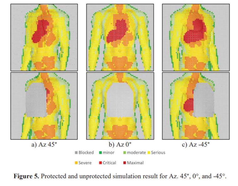 Another Canadian DRDC paper out of Valcartier, this presentation examined how SAPI-type plate sizing – width and length – affect survivability in an anatomical torso model. Using CORE V/L with a 50th‑percentile male avatar, they swept 49 geometries and ran 10,800 simulated shot lines at −45°, 0°, and +45°. Plates were idealized as perfectly blocking on intersection; injuries were mapped to AP/ISS/NISS anatomical models.